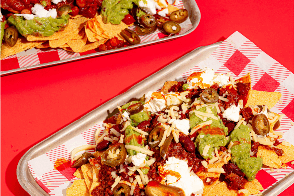 Crispy tortilla chips topped with vegan bean chilli, jalapeños, vegan feta, guacamole, and fresh coriander.